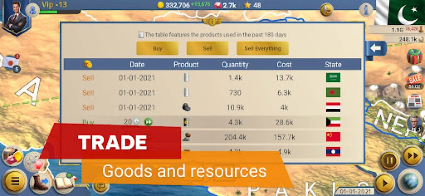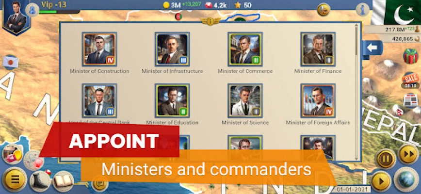 اپنی قوم کی معیشت کو مضبوط کریں: قیمتی وسائل جمع کریں، دیگر ممالک کے ساتھ تجارت کریں، اور خوراک، نمک، چینی، بیکری، مویشی، کنکریٹ، سونا، تیل، لوہا اور بجلی کی وسیع پیمانے پر پیداوار کریں۔ کارخانے، بارودی سرنگیں، آرا ملیں اور شپ یارڈ تعمیر کریں۔ ٹیکس جمع کریں اور ان کو منظم کریں، مرکزی بینک سے قرضے لیں اور سود پر رقم قرض دیں۔ چیلنجوں کا سامنا کرنے کے لیے تیار رہیں، چاہے وہ سمندری ڈاکو اور دہشت گرد ہوں، وبائی امراض، آفات، مظاہرے، یا اقتصادی بحران ہوں۔ ہر دن ایک نیا چیلنج لے کر آتا ہے۔ تعلیم، انفراسٹرکچر، سائنس، سیاحت اور صحت کی دیکھ بھال جیسی وزارتیں قائم کرکے اور ان کی مالی اعانت فراہم کرکے اپنے ملک کو خوشحالی کی نئی بلندیوں پر لے جائیں، اور پولیس، نیشنل گارڈ اور وزارت دفاع کا انتظام سنبھالیں۔